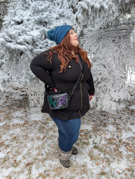 Duality Dragons Crossbody & Clutch/Purse - Green and Purple (Full Grain Leather & Handcrafted in Canada.)