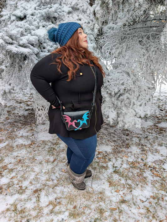 Duality Dragons Crossbody & Clutch/Purse - Pink and Turquoise (Full Grain Leather & Handcrafted in Canada.)