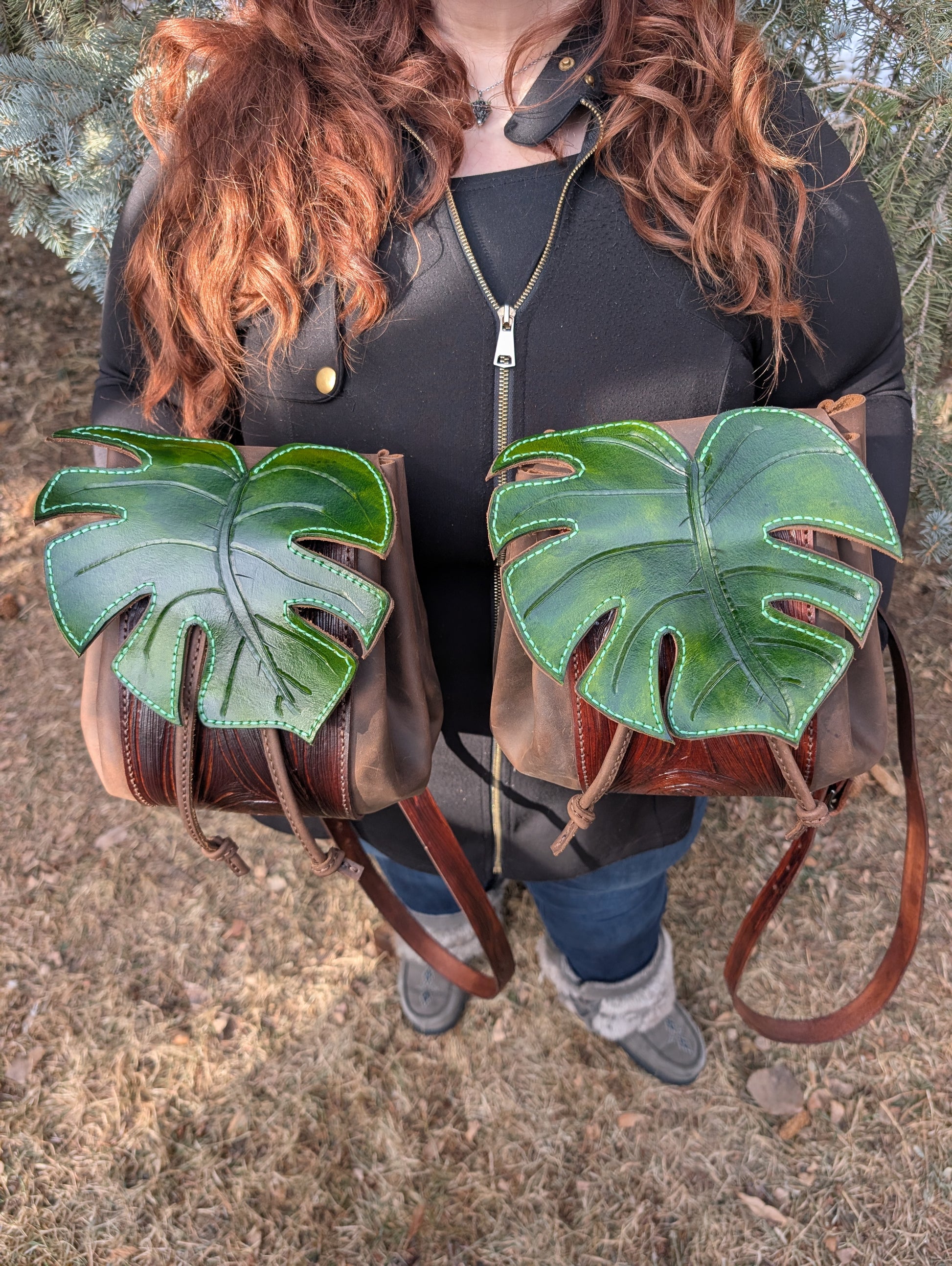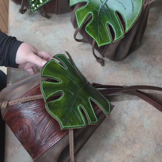 Handmade Leather Monstera Leaf Crossbody Purse (Full Grain & Tooled Wood Grain) - Handmade in Canada🌿