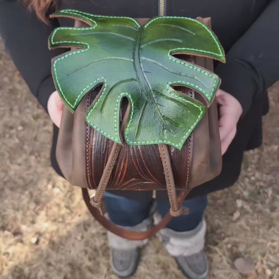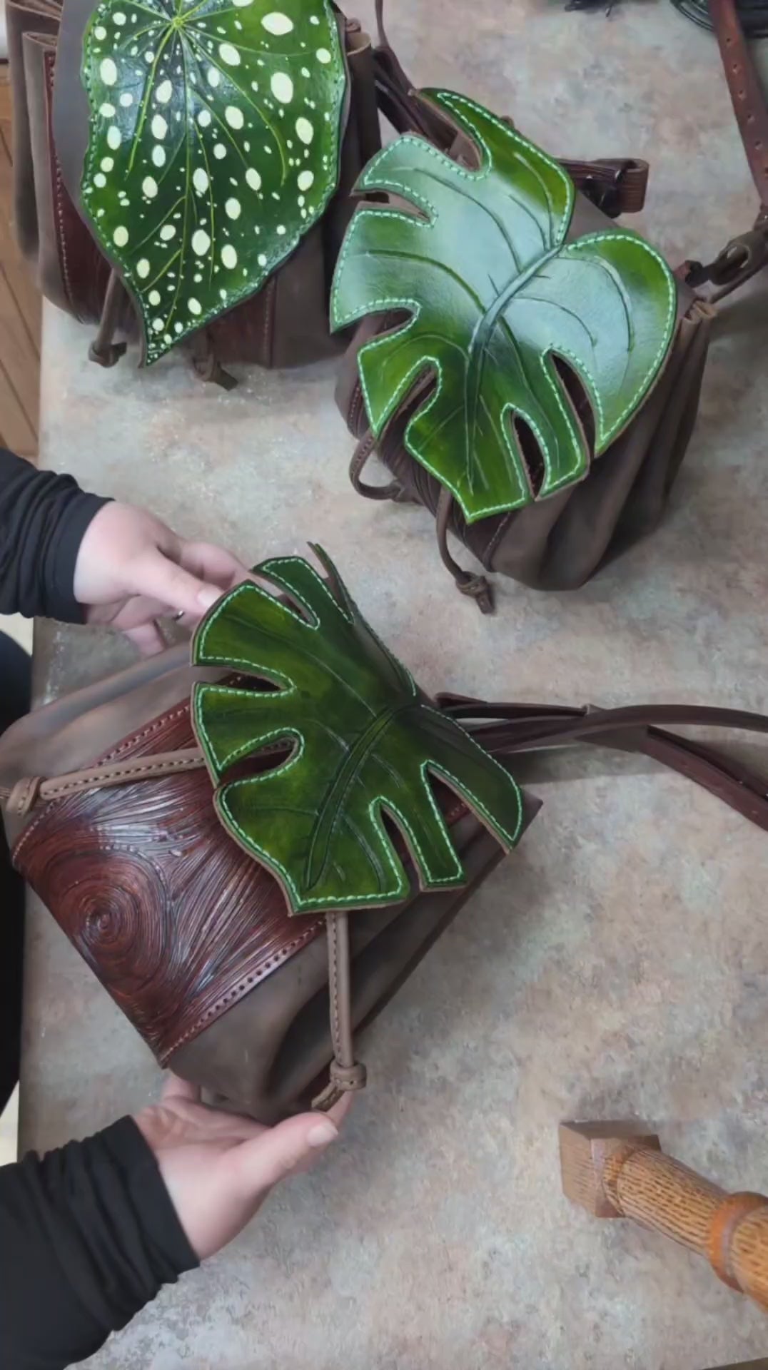 🌿THE LEATHER(S):  The Monstera leaf flap is 5/6 oz veg-tan leather that has been dyed in Green. It is sewn onto a 4/5oz Crazy Horse Hydro flap. The wood grain gusset and wood grain strap are all 7/9oz veg-tan (Full grain) which has all been hand dyed. The veg-tan is firm and gives the bag rigidity and stability.