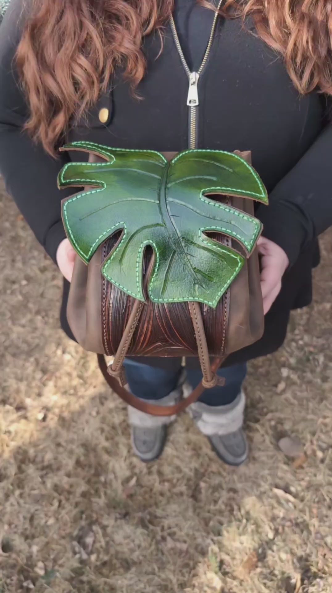 Handmade Leather Monstera Leaf Crossbody Purse (Full Grain Leather & Tooled Wood Grain Details) - Handmade in Canada
