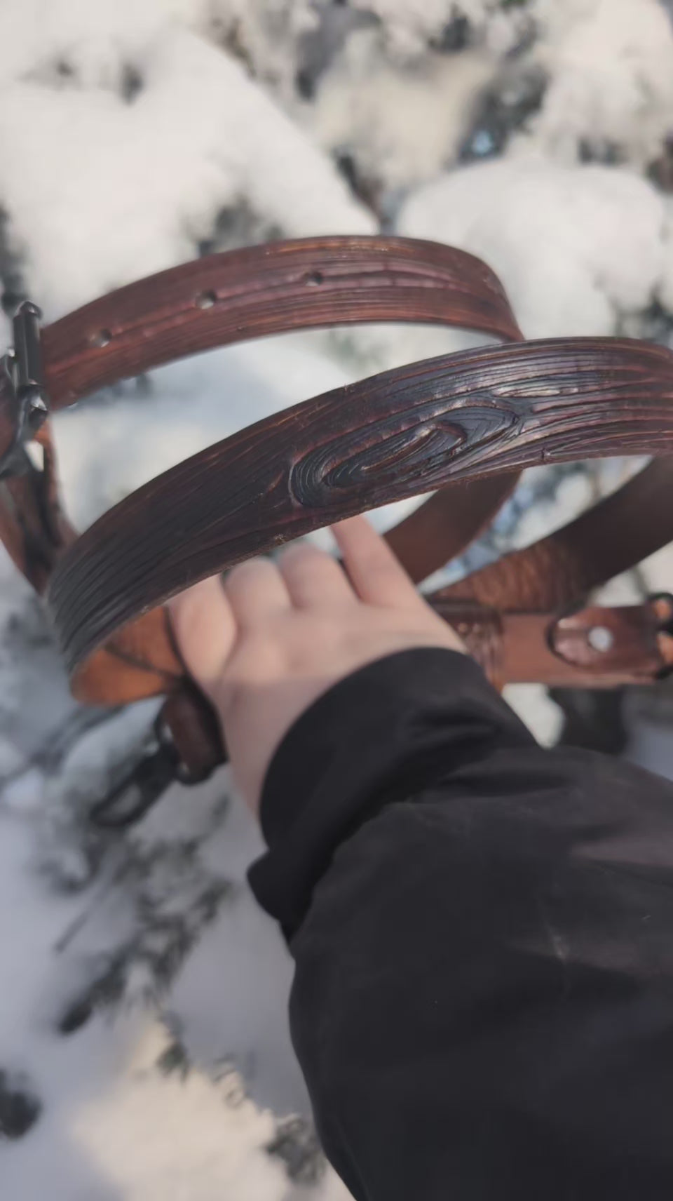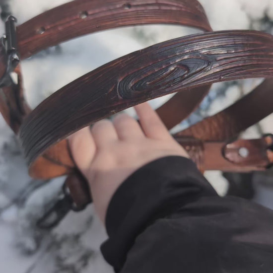 - Fully tooled (carved) wood grain detailing into the branch that the feet are attached to, as well as the entire strap.