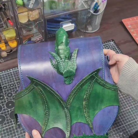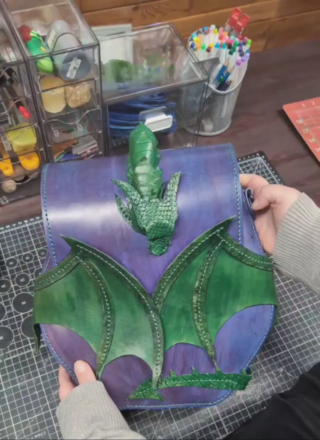 🐲 - The Leather - This statement piece features 3 different hides used! The head, scales and body of the Dragon are from a veg-tan embossed hide in 4/5oz. The wings are a smooth 4/5oz veg-tan, and the body of the bag and front flap are a thick 7/9oz veg-tan.