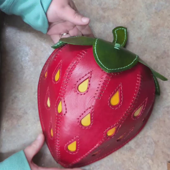 🍓 - The Leather - This adorable statement piece features full grain 7/9 oz vegetable tanned leather for the body of the bag. The green leaf cap is 3/4oz vegetable tanned leather. The cap is a slightly lighter weight leather to allow it to fold and magnetize properly.