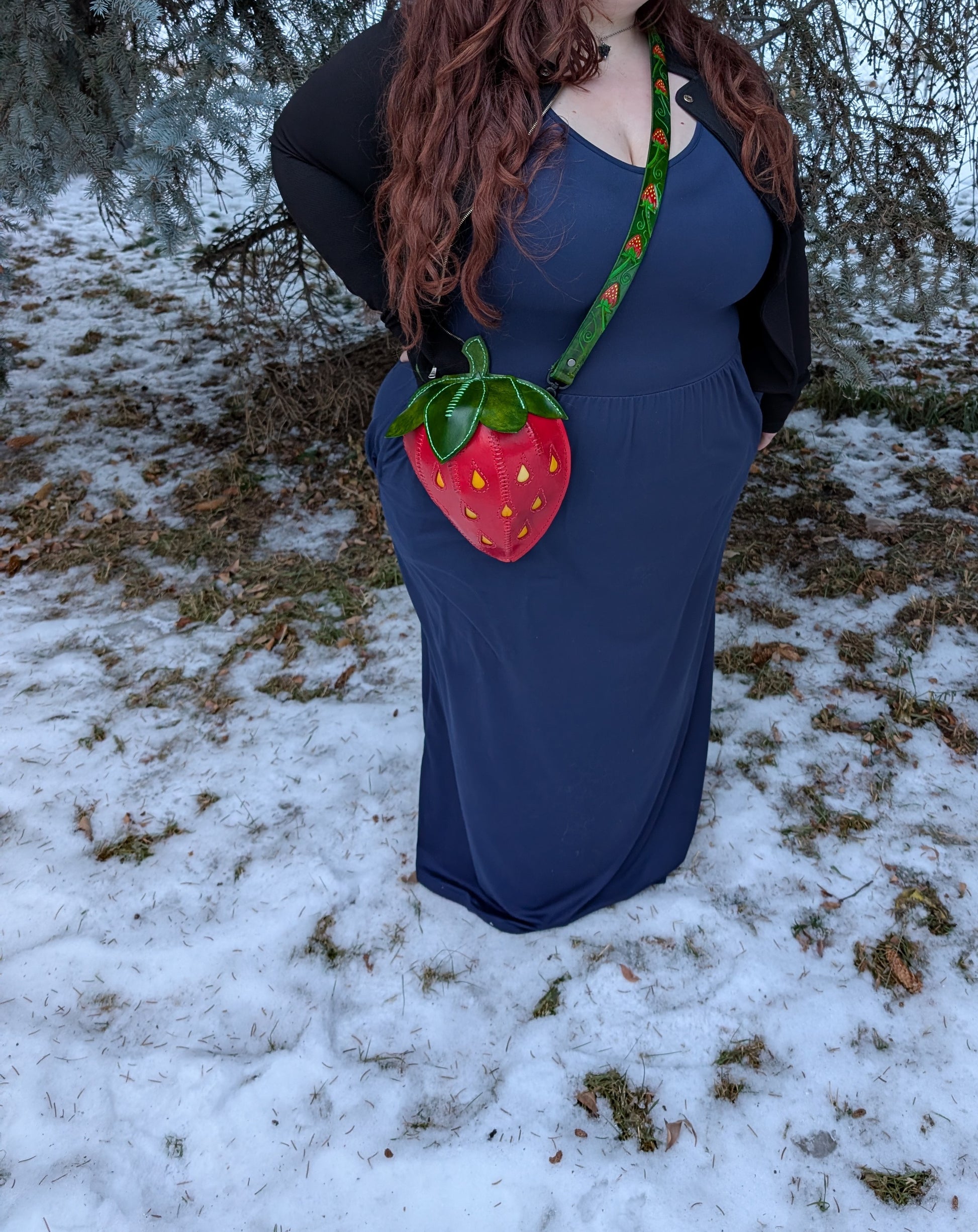🍓 Handmade Leather Strawberry Crossbody Purse with custom tooled and painted strap - Full Grain Leather - Handmade In Canada